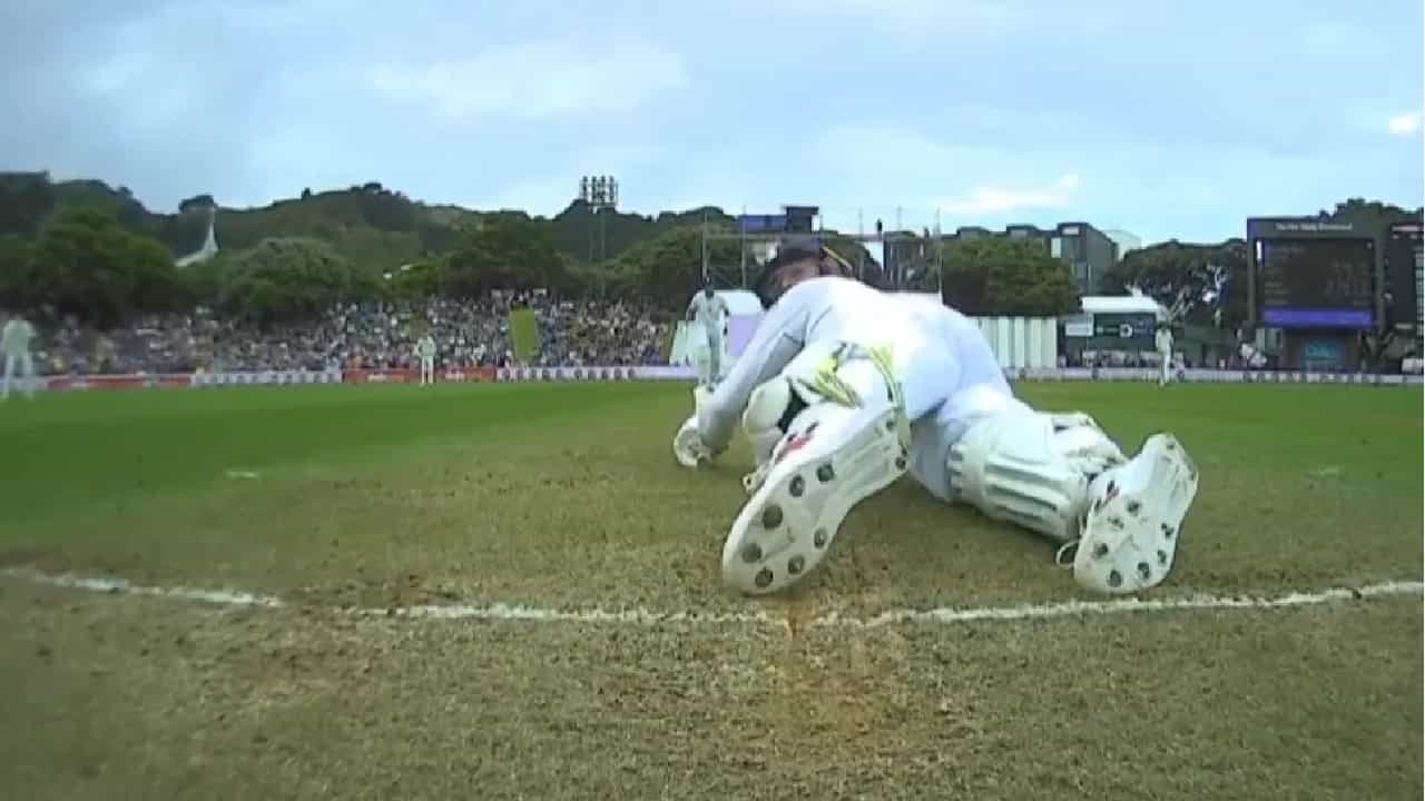 NZ vs ENG Test : क्रिकेट एक रोमांचक खेळ आहे. पण क्रिकेटच्या मैदानात काहीवेळा अशा घटना घडतात, की ज्यामुळे तुम्हाला हसू आवरता येत नाही. वेलिंग्टन कसोटीत इंग्लंडचा विकेटकीपर बॅट्समन बेन फोक्स विचित्र पद्धतीन आऊट झाला. सोशल मीडियावर या विकेटची चर्चा आहे. फोक्स क्रीजवरच पडला पण तो स्वत:ला स्टम्पआऊट होण्यापासून वाचवू शकला नाही. वेलिंग्टनच्या पीचवर बेन फोक्स आऊट झाला. पण त्याचं बाद होणं सोशल मीडियाच्या पीचवर व्हायरल झालं.