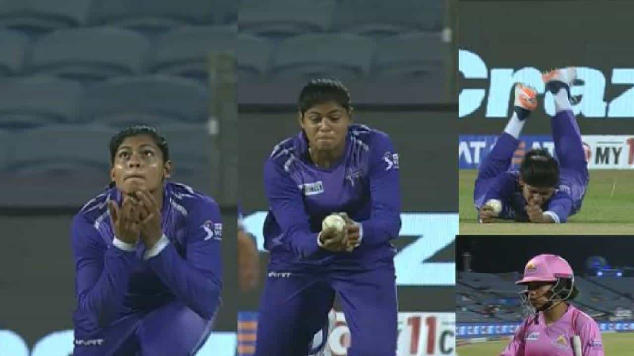 पण चेंडू आणि बॅटचा संपर्क चांगला नव्हता. त्यामुळे चेंडू सीमारेषेबाहेर जाऊ शकला नाही. यावेळी लाँग ऑफच्या दिशेने क्षेत्ररक्षण करणाऱ्या राधा यादवने चटकन चेंडूकडे धाव घेतली आणि डायव्ह मारत झेल पूर्ण केला.