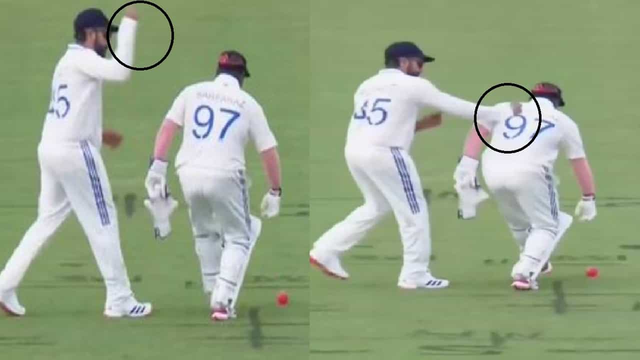 Rohit Sharma Punched Sarfaraz Khan : सर्फराज खान याच्याकडून झालेल्या एका चुकीमुळे कर्णधार रोहित शर्मा संतापला. रोहितने सर्फराजच्या पाठीत बुक्का मारला. त्यानंतर काय झालं? पाहा व्हीडिओ.