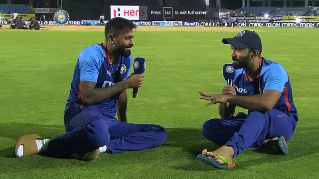 राजकोट येथील सौराष्ट्र क्रिकेट असोसिएशन स्टेडियमवर भारत आणि दक्षिण आफ्रिका यांच्यात पाच सामन्यांच्या मालिकेतील चौथा टी-20 आंतरराष्ट्रीय सामना खेळला गेला. या सामन्यात भारतानं एकवेळ 81 धावांवर चार विकेट गमावल्या होत्या. 13 षटकांपर्यंत भारताची धावसंख्या अशीच फारशी चांगली नव्हती. पण त्यानंतर हार्दिक पांड्या आणि दिनेश कार्तिक यांनी मिळून असा कहर केला की दक्षिण आफ्रिकेचे गोलंदाजही घाबरले. दिनेश कार्तिकनं 27 चेंडूत 55 आणि हार्दिकने 31 चेंडूत 46 धावांचे योगदान दिलं. सामन्यानंतर बीसीसीआयनं त्यांच्या संभाषणाचा व्हिडीओ शेअर केलाय. यामध्य दिनेश कार्तिकनं सांगितलं की, त्यानं आणि हार्दिकने विझाग ते राजकोटच्या फ्लाइटमध्ये राजकोट T20 मास्टर प्लॅन कसा बनवला होता.