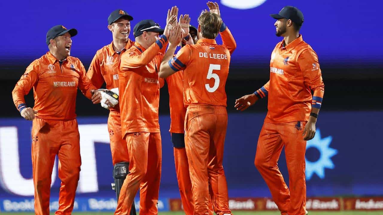 नेदरलँड: विक्रमजीत सिंग, मॅक्स ओ’डॉड, कॉलिन अकरमन, बास डी लीडे, तेजा निदामानुरु, स्कॉट एडवर्ड्स (कर्णधार आणि विकेटकीपर), सायब्रँड एंजेलब्रेक्ट, लोगन व्हॅन बीक, रोएलॉफ व्हॅन डर मर्वे, आर्यन दत्त, पॉल व्हॅन मीकरेन.