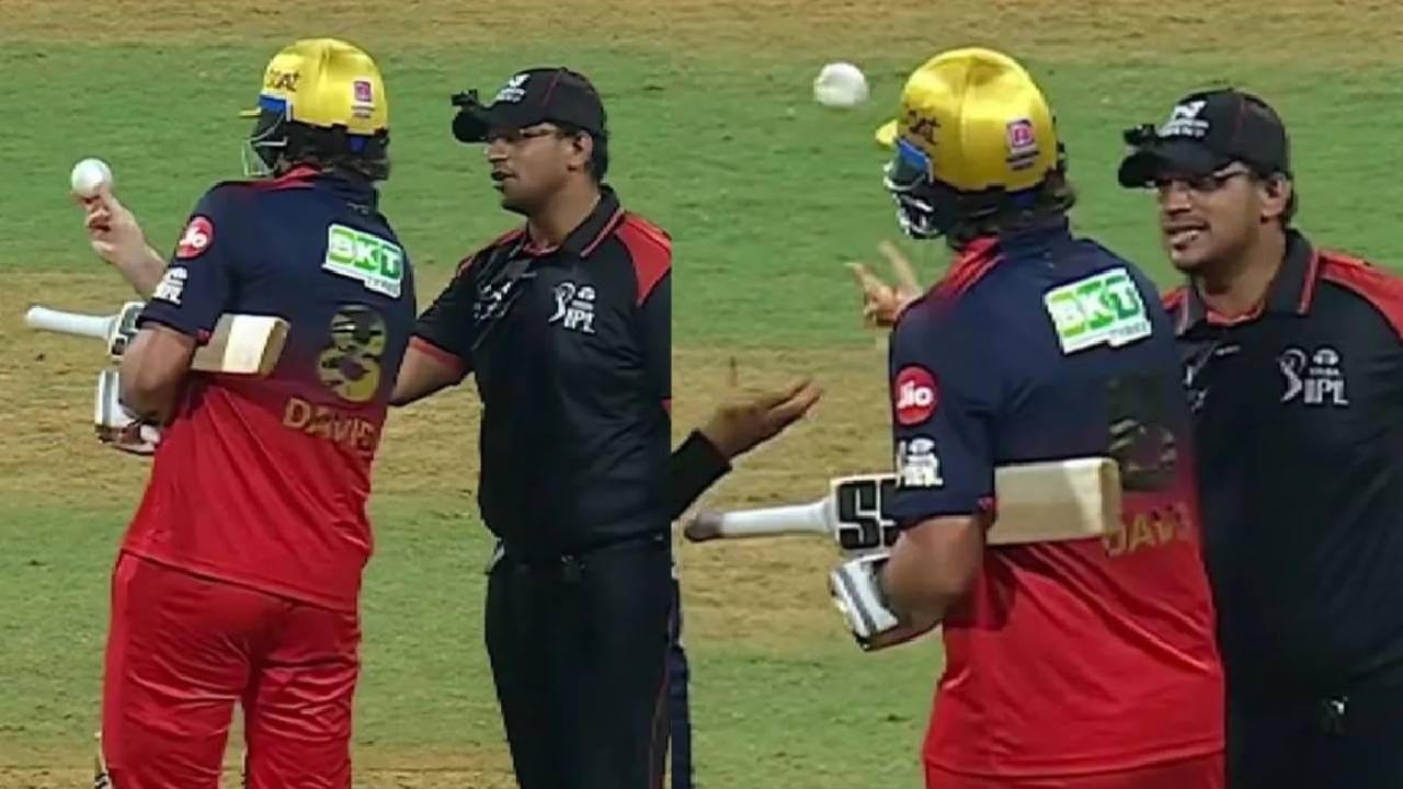आरसीबीचा डाव सुरू असताना 18 व्या षटकात हा प्रकार घडला. हार्दिक पांड्या हे षटक टाकत होता आणि पहिल्याच चेंडूवर टिम डेविडने चौकार मारला. त्यानंतरचा चेंडू हार्दिक नो टाकला. त्यामुळे हा चेंडू परत टाकण्याची वेळ आली, तसेच फ्री हिट मिळाल्याने टिम डेविडने त्याचा पुरेपूर फायदा घेतला. त्याने या चेंडूवर षटकार मारला. पण जेव्हा हा चेंडू मैदानात आला तेव्हा त्याचा खूपच ओला असल्याचं दिसून आलं. तसेच त्याचा आकारही थोडा बदलला होता. त्यामुळे पंचांनी हा चेंडू बदलण्याचा निर्णय घेतला. चेंडूंचा बॉक्स मैदानावर आला, तेव्हा टिम डेविडने त्यातील एक चेंडू उचलला आणि त्याच्याशी खेळू लागला. तसेच हवेत उडवून पाहिला. यावेळा त्याने ही कृती वारंवार केली. पंच वारंवार चेंडू मागत होते, पण तो परत करण्याऐवजी डेव्हिड आपली गंमत करत राहिला. डेव्हिडच्या या कृतीने पंच थोडे चिडलेले दिसले.