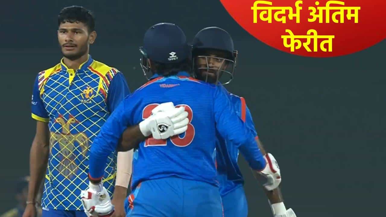 विजय हजारे ट्रॉफी 2025-26 स्पर्धा आता अंतिम टप्प्यात आली आहे. या स्पर्धेतील उपांत्य फेरीचा एक सामना विदर्भ आणि कर्नाटक यांच्यात पार पडला. हा सामना विदर्भाने 6 गडी राखून जिंकला आणि अंतिम फेरीत धडक मारली आहे. कर्नाटकने नाणेफेकीचा कौल जिंकला होता. पण प्रथम फलंदाजी करण्याचा निर्णय चुकला. कर्नाटकने 49.4 षटकात सर्व गडी गमवून 280 धावा केल्या. तसेच विजयासाठी 281 धावांचं आव्हान दिलं. हे आव्हान विदर्भाने 46.2 षटकात 4 गडी गमवून पूर्ण केलं. या सामन्यातील विजयाचा शिल्पकार ठरला तो गोलंदाज दर्शन नळकांडे आणि फलंदाज अमन मोखाने.. दर्शन नळकांडेने 10 षटकात 48 धावा देत 5 गडी बाद केले. त्याच्या भेदक गोलंदाजीमुळे निम्मा संघ तंबूत गेला. तर धावांचा पाठलाग करताना अमन मोखाडेने 122 चेंडूत 12 चौकार आणि 2 षटकार मारत 138 धावा केल्या. आता विदर्भाचा अंतिम फेरीत सामना पंजाब विरुद्ध सौराष्ट्र सामन्यातील विजेत्याशी होईल.
