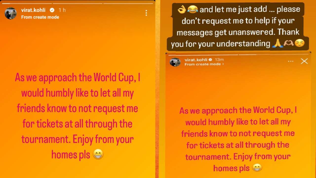 विराट कोहली याने इंस्टास्टोरीवर एक मेसेज दिला आहे. त्यात त्याने लिहिलं आहे की, “आम्ही वर्ल्डकप खेळायला जात आहोत. त्यामुळे मी माझ्या सर्व मित्रांनी विनंती करतो की माझ्याकडे तिकीट मागू नका. तुम्हीच घरूनच सामन्याचा आनंद लुटा.” विराट कोहलीच्या या विनंतीनंतर अनुष्कानेही यावर आपली प्रतिक्रिया नोंदवली आहे. विराट कोहलीच्या मेसेजचा स्क्रीनशॉट शेअर करत लिहिलं की, ‘यात मी आणखी एक बाब जोडत आहे. जर कोणाला मेसेजचं उत्तर मिळालं नाही तर माझ्याकडून मदत मागू नये. समजून घ्याल धन्यवाद.’