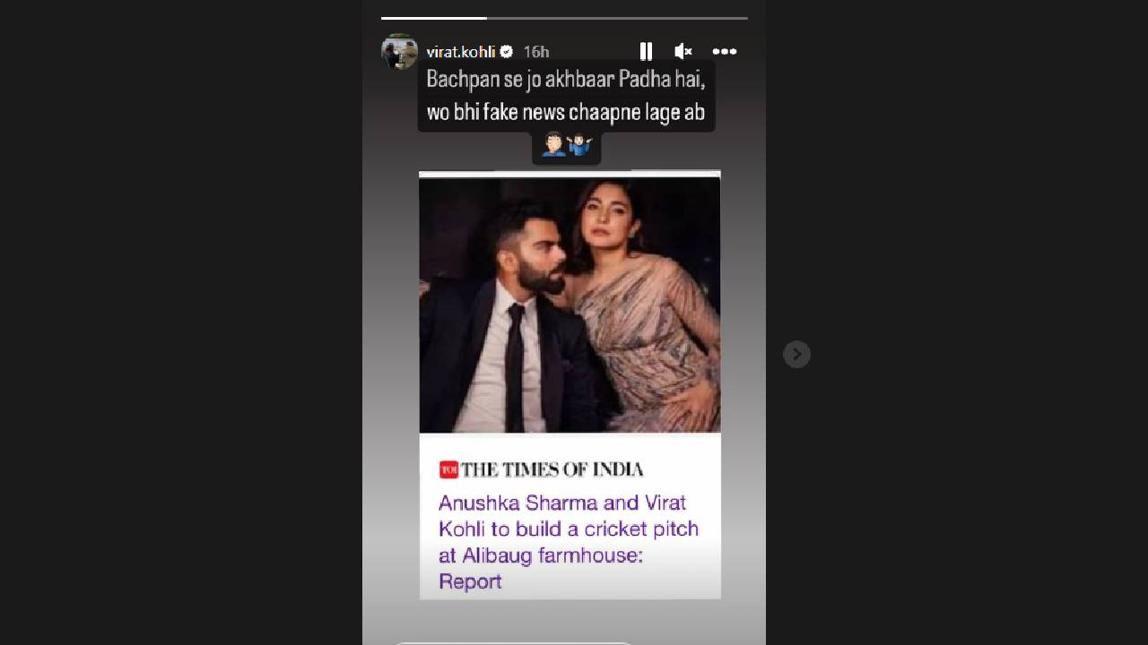 मुंबई | 16 ऑगस्ट 2023 : क्रिकेटर विराट कोहली त्याच्या अलिबागच्या फार्महाऊसवर क्रिकेट पिच बनवणार असल्याच्या चर्चांना उधाण आलं होतं. असा दावा करणाऱ्या एका वृत्तावर आता थेट विराटनेच प्रतिक्रिया दिली आहे. विराट कोहली आणि अनुष्का शर्माने झिराड गावात आठ एकरची जागा खरेदी केली होती. याच ठिकाणी तो क्रिकेट पिच बांधणार असल्याचं म्हटलं जात होतं. मात्र विराटने त्याच्या इन्स्टाग्राम स्टोरीमध्ये यासंदर्भातील वृत्त शेअर करत खरी माहिती सांगितली. विराटने त्याच्या इन्स्टाग्राम स्टोरीमध्ये लिहिलं, ‘बचपन से जो अखबार पढा है, वो भी फेक न्यूज छापने लगे अब’ (लहानपणापासून जे वृत्तपत्र वाचलं, तेसुद्धा आता फेक न्यूज देत आहेत). यासोबतच त्याने संबंधित वृत्त शेअर केलं आहे.