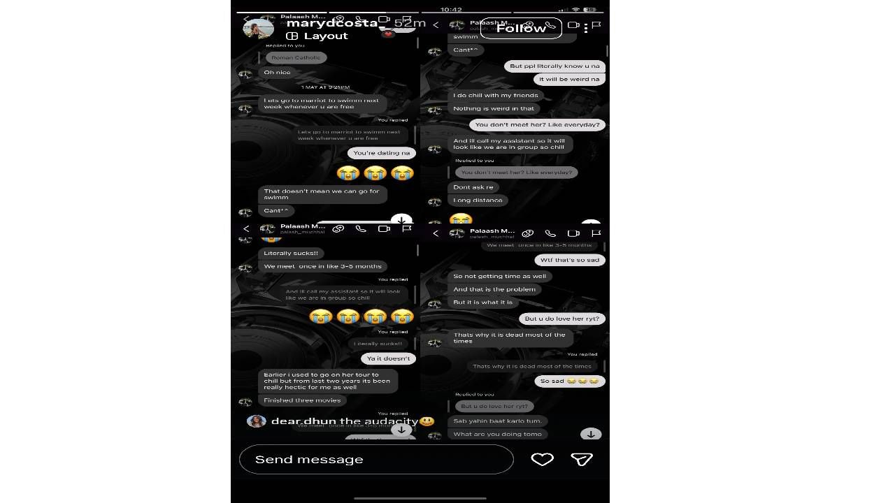 मे 2025 च्या एका मेसेजमध्ये पलाश मेरीला पोहायला जाण्यास सांगताना दिसतोय. जेव्हा ती त्यांच्या नात्याच्या स्टेटसबद्दल जाणून घेण्याचा प्रयत्न करते किंवा तो तिच्या प्रेमात आहे की नाही हे जाणून घेण्याचा प्रयत्न करते, तेव्हा पलाश प्रश्न टाळतो. मेरीला स्पष्ट उत्तर देण्याऐवजी तिने भेटण्यासाठी होकार द्यावा यासाठी तो प्रयत्न करतो. या चॅट्समुळे स्मृती आणि पलाश या जोडीच्या चाहत्यांना मोठा धक्का बसला आहे.