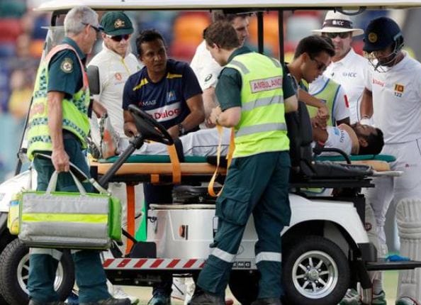 करुणारत्नेने हेल्मेट घातलेलं होतं. पण हेल्मेट आणि मान यांच्या मध्ये हा चेंडू लागल्याने तो जागेवरच कोसळला. करुणारत्ने कोसळला त्यावेळी त्याने 85 चेंडूंमध्ये 46 धावा कल्या होत्या. ऑस्ट्रेलियाने तीन शतकांच्या बळावर पहिल्या डावात मोठी धावसंख्या उभारली आहे. ऑस्ट्रेलियाने चार बाद 384 धावांहून पुढे खेळण्यास सुरुवात केली आणि पाच बाद 534 धावांवर डाव घोषित केला.