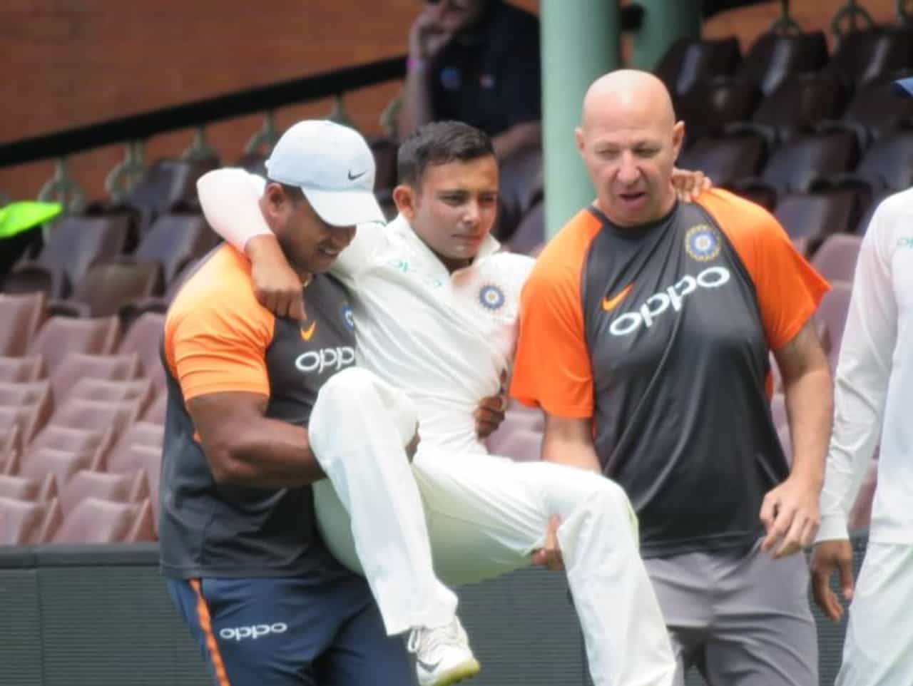 अश्विनच्या गोलंदाजीवर मॅक्स ब्रायन्टने एक फटका लगावला, तो झेलण्यासाठी पृथ्वी शॉ धावला आणि त्याला गंभीर दुखापत झाली. त्यानंतर पृथ्वी शॉ मैदानातच कोसळला. पृथ्वी शॉ वेदनेने तळमळत होता. त्याची ती अवस्था पाहून संघाचे फिजीओ मैदानात धावत आले. पृथ्वी शॉला दोघांनी अक्षरश: उचलून ड्रेसिंग रुममध्ये घेऊन जावं लागलं. त्यानंतर पृथ्वी शॉला पुढील उपचारासाठी, पायाच्या स्कॅनिंगसाठी रुग्णालयात नेण्यात आलं.