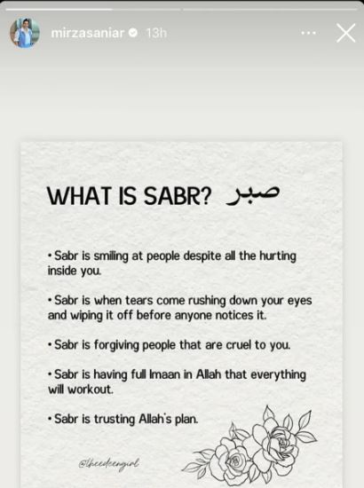 सानिया मिर्झा हिने जी पोस्ट शेअर केली आहे त्यात ‘ व्हॉट इज सब्र’ असा मथळा दिला आहे. यासंपूर्ण पोस्टमध्ये सानिया हिने शोएब मलिक याचे नाव घेतले नाही. परंतु तिचा रोख त्याच्याकडेच होता. शोएबला माफ केल्याचे तिने म्हटले आहे. सोनियाने इंस्टाग्रामवर एक स्टोरी शेअर केली आहे. त्यात लिहिले की, ‘जेव्हा तुमच्यावर दु:खाचा डोंगर कोसळला असेल, परंतु बाहेरच्या जगात तुमच्या चेहऱ्यावर हास्य असेल. डोळ्यातून अश्रू येतील, परंतु ते पाहण्यापूर्वी ते पुसून घेतले असणार. ज्याने तुमच्यासोबत चुकीचा व्यवहार केला, त्याला माफ करणेही ‘सब्र’ आहे. अल्लाहवर विश्वास ठेवावा, जे होईल ते सर्व ठीक होईल. अल्लाहच्या प्लॅनवर विश्वास ठेवणेही सब्र आहे.