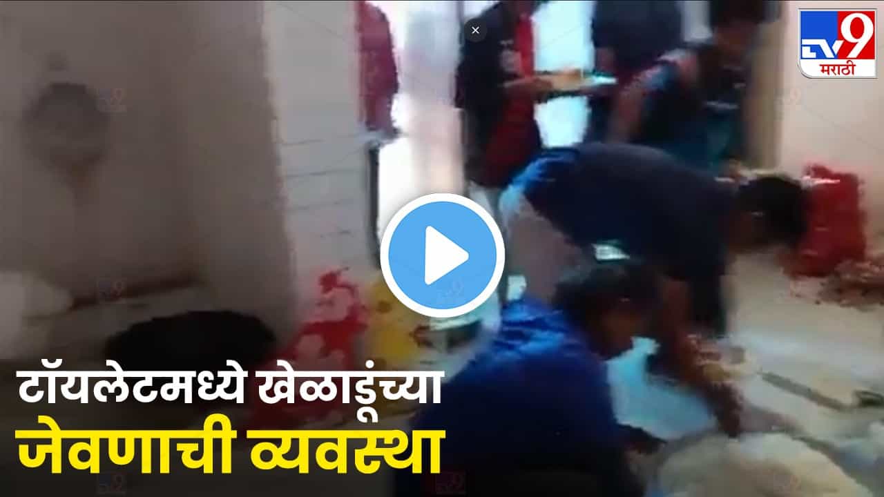 ज्यावेळी हे प्रकरण उजेडात आले त्यावेळी संबंधिक अधिकाऱ्याला निलंबित केल्याची माहिती मिळाली होती. तसेच मैदानात अधिक खेळाडू असल्याने त्यांची जेवणाची व्यवस्था मैदानात करण्यात आली होती. परंतु त्यावेळी अचानक पाऊस सुरु झाला, टॉयलेटमध्ये कोणी जेवन घेऊन गेलं याबाबत अद्याप माहिती नाही असं उत्तर अधिकाऱ्यांनी दिलं आहे.