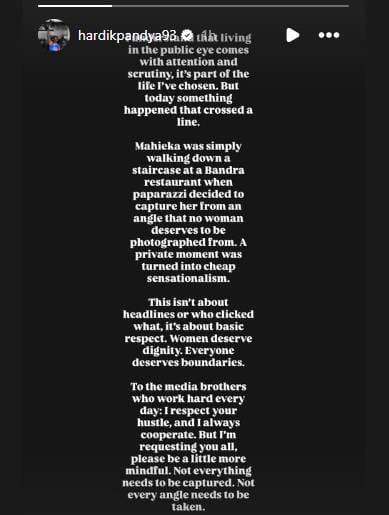 त्यानंतर हार्दिकने इन्स्टाग्रामवर त्याच्या अकाऊंटवरून एक लांबलचक पोस्ट लिहीत, स्टोरी शएअर केली आहे. ” तुम्ही सार्वजनिक जीवनात असता तेव्हा लोकांच्या नजरा तुमच्यावर असतात. मी या आयुष्याचा स्वीकार केला आहे, पण आज असं काही घडलं ज्याने सर्व मर्यादा ओलांडल्या आहेत. माहिका ही वांद्रे येथील एका रेस्टॉरंटच्या पायऱ्या उतरून खाली येत होती, मात्र तिथे असलेल्या पापाराझींनी एका अशा अँगलने तिचा व्हिडीओ बनवला जो कणत्याही महिलेसाठी योग्य नाही. एका खासगी क्षणाला खळबळजनक रूप देण्यात आलं. प्रत्येक महिलेला सन्मान हवा असतो आणि प्रत्येक गोष्टीची एक मर्यादा असे. मीडियातील माझे भाऊ खूप मेहनत करतात याची मला कल्पना आहे, पण मी तुम्हा सगळ्यांना सांगू इच्छितो की जरा काळजी घ्या. प्रत्येक गोष्ट कॅमेऱ्यात कॅप्चर करणं योग्य नसतं. सगळे अँगल (शूट करणं) गरजेचं नाही. जरा माणुसकीने वागा” अशा शब्दांत हार्दिकने फोटो ग्राफर्सना फटकारलं आहे.