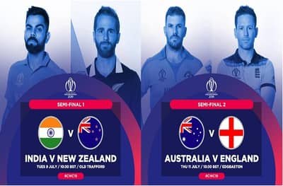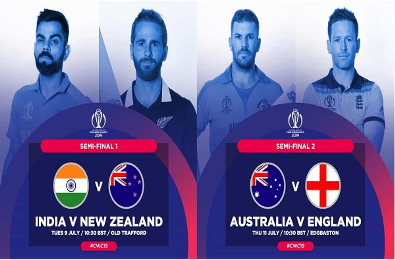 भारत वि. न्यूझीलंड हा पहिला सेमीफायनल मँचेस्टरमध्ये 9 जुलैला खेळवण्यात येईल. तर आॅस्ट्रेलिया वि. इंग्लंड हा दुसरा सेमीफायनल 11 जुलैला होईल आणि दोन विजयी संघ विश्वविजेता होण्यासाठी 14 तारखेला लाॅर्ड्सवर भिडतील.