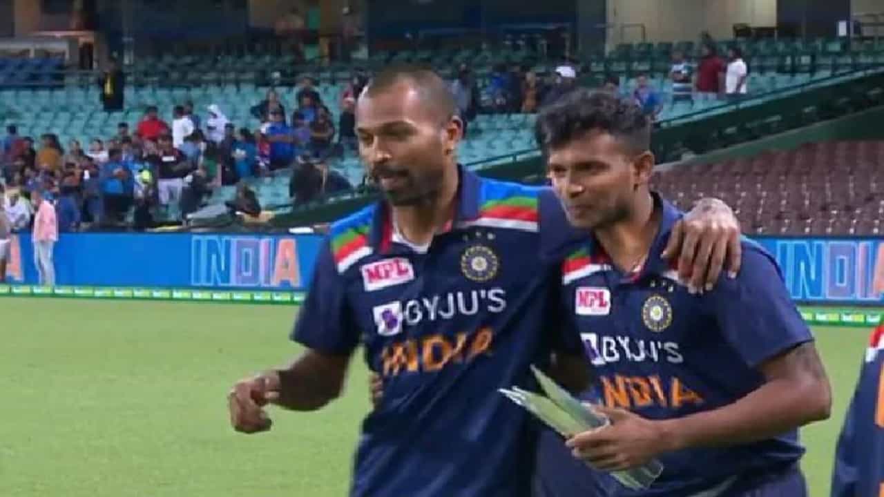 (India Vs Aus hardik pandya handed over his man Of the Series Award to bowler T Natrajan)