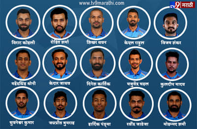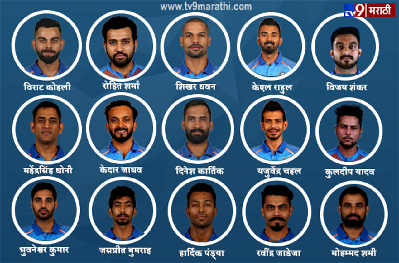 विराट कोहली (कर्णधार), रोहित शर्मा (उपकर्णधार), शिखर धवन, केएल राहुल, विजय शंकर, महेंद्रसिंह धोनी, केदार जाधव, दिनेश कार्तिक, यजुवेंद्र चहल, कुलदीप यादव, जसप्रीत बुमराह, भुवनेश्वर कुमार, हार्दिक पंड्या, रवींद्र जाडेजा आणि मोहम्मद शमी,