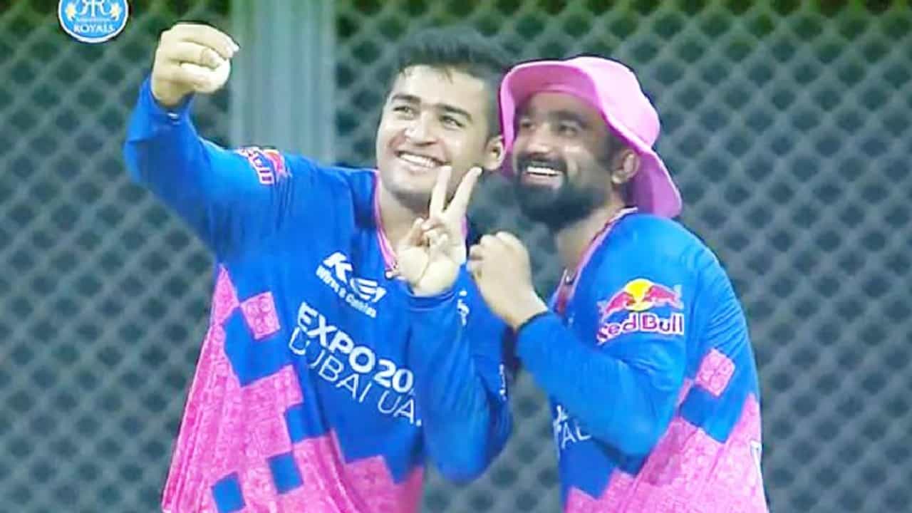 शेवटच्या काही ओव्हरमध्ये फटकेबाजी करणाच्या मुडमध्ये असणाऱ्या पॅट कमिन्सचा अवघड वाटणारा कॅच रियान परागने बाऊन्ड्री लाईनवर घेतला. यावेळी रियान परागच्या शेजारी राहुल तेवतिया फिल्डिंग करत होता. या दोघांनीही कॅचनंतर सेल्फीची अॅक्टिंग केली. परंतु त्यांच्या हातात ना मोबाईल होता ना सेल्फी स्टिक…! तरीही दोघेही अतिशय थाटात उभे राहिले आणि जसं आपण सेल्फीला पोझ देतो तशी पोझ त्यांनी दोन सेकंद देऊन खास पद्धतीने सेलिब्रेशन केलं.