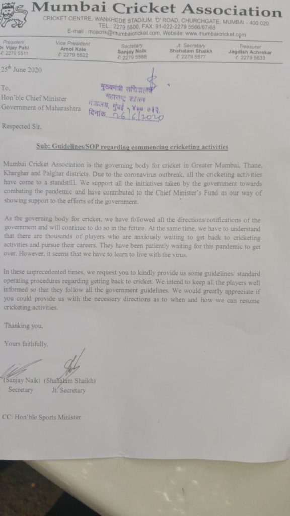 “क्रिकेटच्या सरावादरम्यान सरकारने दिलेल्या अटी शर्तीचं पालन केले जाईल. याच पार्श्वभूमीवर खेळाडूंना सरावाची परवानगी देण्यात यईल,” असे या पत्रात नमूद करण्यात आला आहे.