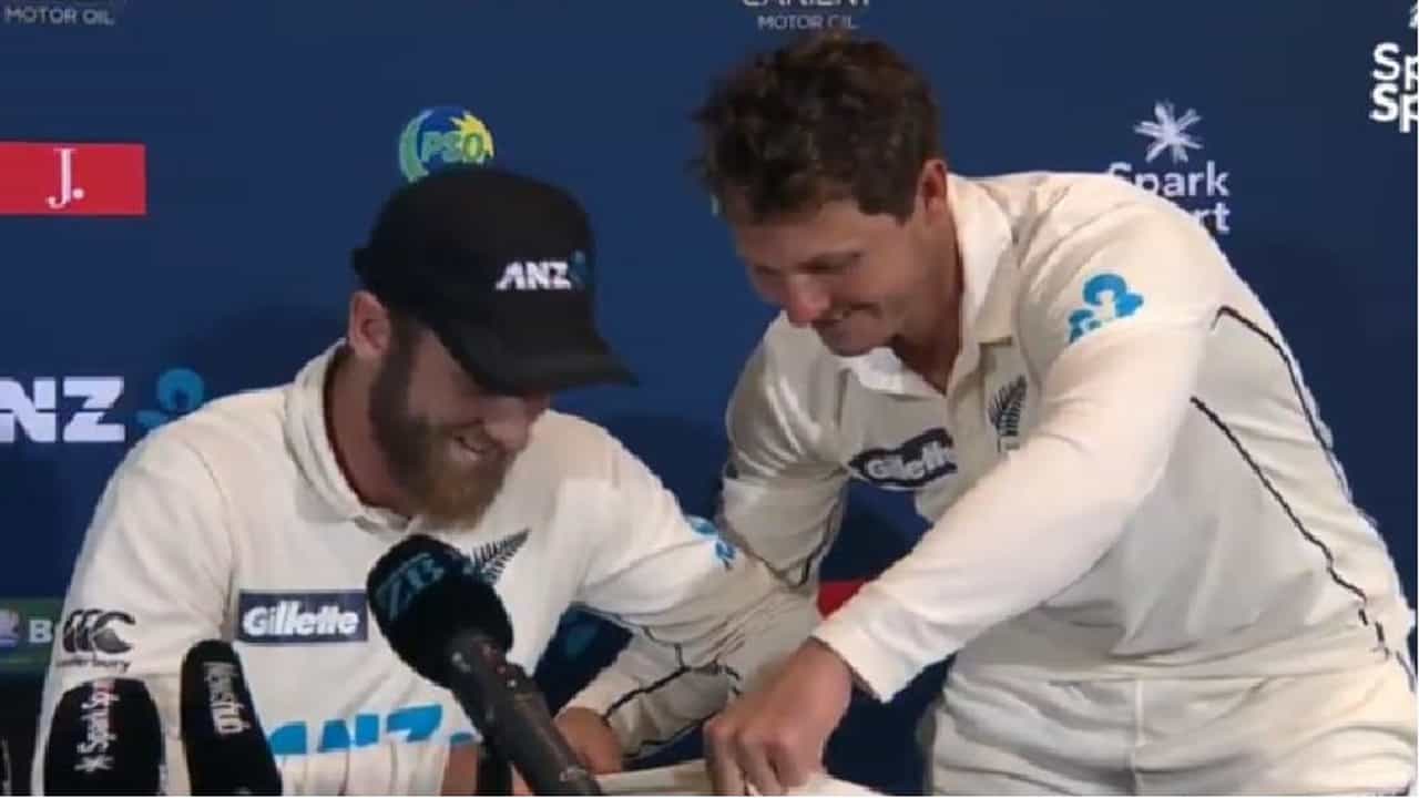 NZ Vs Pak : न्यूझीलंड विरुद्ध पाकिस्तान यांच्यात खेळल्या गेलेल्या दुसऱ्या कसोटी सामन्यात न्यूझीलंडने पाकिस्तानचा एक डाव आणि 176 रन्सनी धुव्वा उडवत पाकिस्तानला लोळवलं. पाकिस्तानविरुद्ध रेकॉर्डब्रेक कामगिरी करुन कसोटी क्रिकेटच्या इतिहासात न्यूझीलंड पहिल्यांदाच टेस्ट रँकिंगमध्ये नंबर एक वर विराजमान झाला आहे. विजयी आनंदोत्सव साजरा केल्यानंतर विल्यमसन पत्रकार परिषदेत बोलत असताना क्रिकेटरसिकांना एक विलोभणीय दृश्य बघायला मिळालं. न्यूझीलंड संघाचा विकेटकिपर बीजे वॉटलिंगने प्रेस कॉन्फरन्स सुरु असतानाच मध्ये येऊन विल्यमसनचा ऑटोग्राफ घेतला. (New Zealand WC Watling To take Captain kane Williamson Press Conference)