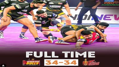 बेंगळुरु: यू मुंबा-यूपी योद्धानंतर बेंगळुरु बुल्स विरुद्ध तेलगु टायटन्स हा प्रो कबड्डी लीग स्पर्धेतील आजच्या दिवसातील सलग दुसरा सामना टाय झाला. दोन्ही संघांचे प्रत्येकी 34-34 गुण झाले. बेंगळुरूचा स्टार पवन कुमार संपूर्ण सामन्यात विशेष चमक दाखवू शकला नाही. पण शेवटच्या क्षणाला टायटन्सचा रेडर रोहित कुमारची पकड करुन संघाला पराभवपासून वाचवलं. यू मुंबाकडून सलामीच्या सामन्यात पराभूत झाल्यानंतर बेंगळुरु बुल्सने सलग तीन विजय मिळवले होते. (Pro Kabaddi League PKL 2021 22 Bengaluru Bulls vs Telugu Titans tie)