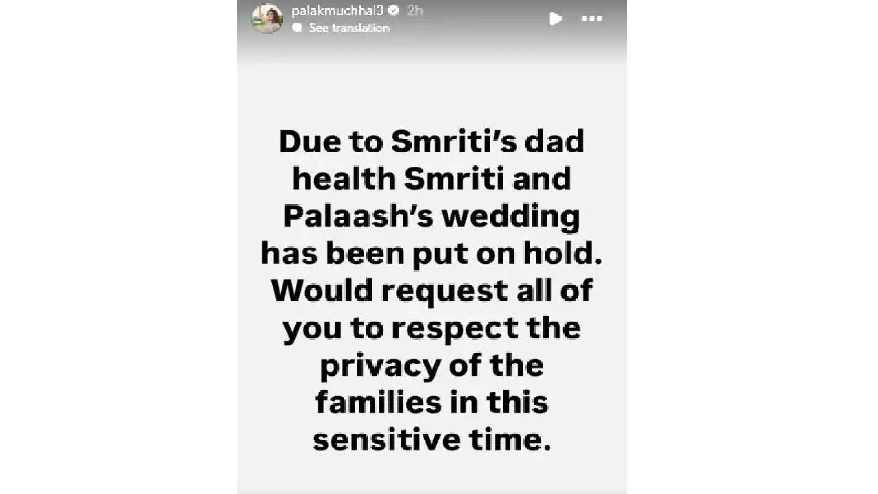 ‘स्मृतीच्या वडिलांच्या प्रकृतीमुळे स्मृती आणि पलाश यांचं लग्न पुढे ढकलण्यात आलं आहे. या संवेदनशील काळात कुटुंबांच्या गोपनीयतेचा आदर करण्याची आम्ही तुम्हा सर्वांना विनंती करतो’, असं तिने तिच्या इन्स्टाग्राम स्टोरीमध्ये पोस्ट केलं. सोमवारी पलाशचीही प्रकृती बिघडल्याची माहिती समोर आली होती. त्यानंतर त्यालाही रुग्णालयात दाखल केलं होतं. डिस्चार्ज मिळाल्यानंतर पलाश त्याच्या कुटुंबीयांसोबत मुंबईला निघून आला, तर स्मृती अद्याप सांगलीतच आहे.