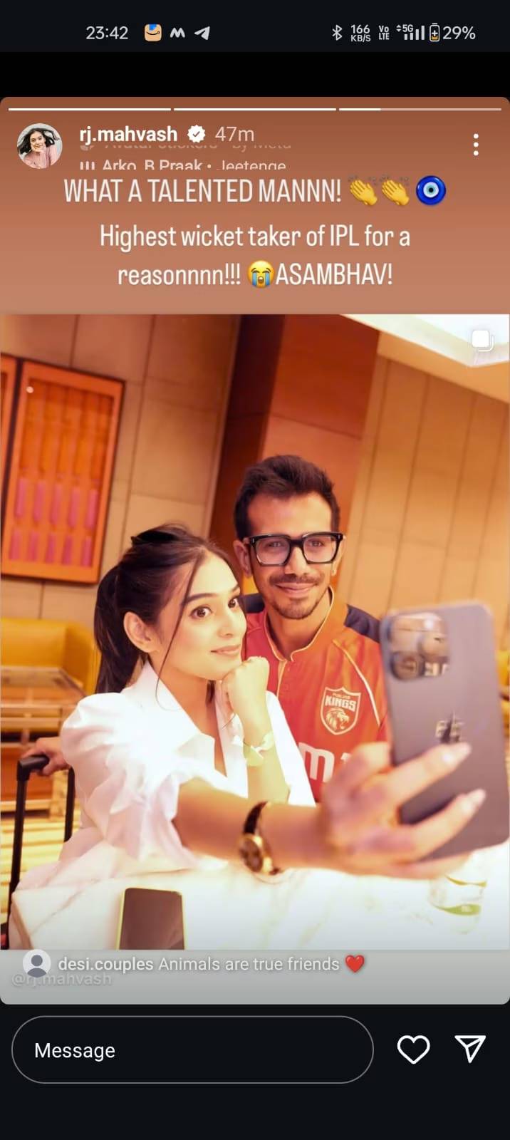 मचहलच्या जादूमुळे पंजाबने हा सामना जिंकला आणि त्याच्या शानदार खेळीसाठी चहलला प्लेयर ऑफ दि मॅचचा पुरस्कारही देण्यात आला. मात्र त्याचं कौतुक फक्त मैदानावरच झालं नाही तर आरजे महवशनेही चहलच्या कौतुकासाठी खास पोस्ट केली. तिने चहलसोबत सेल्फी काढत असतानाचा, एक फोटो इंस्टाग्राम स्टोरीवर शेअर केला. ‘(तू) किती प्रतिभावान माणूस आहेस, म्हणूनच तू आयपीएलमध्ये सर्वाधिक विकेट घेणारा गोलंदाज आहेस, असंभव.’ असे कौतुकाचे शब्दही महवशने चहलसाठी लिहीले.