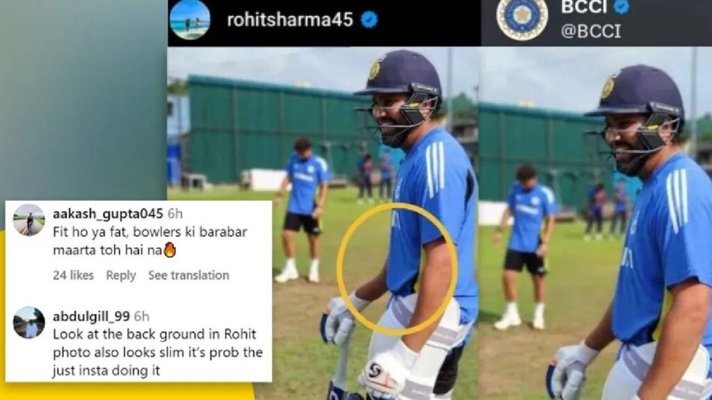 रोहितने शेअर केलेल्या पहिल्या फोटोमध्ये तो निळ्या रंगाच्या टी-शर्टमध्ये दिसतोय, त्यात त्याचं पोट दिसत नाहीये. पण BCCI ने असाच फोटो शेअर केला असून त्यामध्ये तर रोहितचं पोट ( थोडं बाहेर आलेलं) दिसत आहे. त्यामुळे रोहितने स्लिम दिसण्यासाठी (त्याने शेअर केलेल्या फोटोत) बदल केला असल्याचं म्हटलं जात आहे.