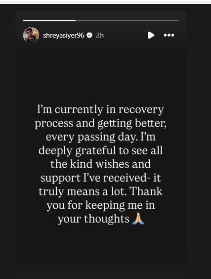मी सध्या रिकव्हर होत आहे, आणि दररोज माझी प्रकृती आधीपेक्षा जास्त सुधारत आहे. मला मिळालेल्या सर्व शुभेच्छा आणि पाठिंब्याबद्दल मी मनापासून आभार व्यक्त करतो, त्या खूप महत्वाच्या आहेत. तुम्ही माझ्यासाठी केलेल्या या प्रार्थनेबद्दल मी मनापासून आभारी आहे असं म्हणत श्रेयस अय्यरने त्याच्या सर्व चाहत्यांचे मनापासून आभार मानले आहेत.