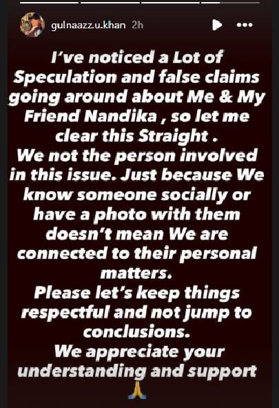 ‘ सध्या मी आणि माझी मैत्रीण नंदिका हिच्याबद्दल अनेक खोटे तर्कवितर्क आणि चुकीचे क्लेम्स, विधानं केली जात असल्याचं माझ्या निदर्शनास आलं आहे. म्हणून मला एकदाच ही गोष्ट स्पष्ट करायची आहे. सध्या सुरू असलेल्या इश्यूमध्ये आमचा काहीही सहभाग नाहीये. एखाद्या व्यक्तीला सोशली ओळखतो म्हणून किंवा त्या व्यक्तीसोबत फोटो काढला म्हणून आमचं त्या व्यक्तीच्या वैयक्तिक आयुष्याशी घेणंदेणं आहे असं होत नाही. कृपया धाडकन कोणत्याही निर्णयावर येऊ नका, आदर राखा. तुमचा समजूतदारपणा आणि सपोर्ट, यासाठी आभारी आहोत’ असं तिने पोस्टमध्ये नमूद केलं आहे. आपला या प्रकरणाशी दुरान्वयेही संबंध नसल्याचं तिने यातून स्पष्ट केलं आहे.