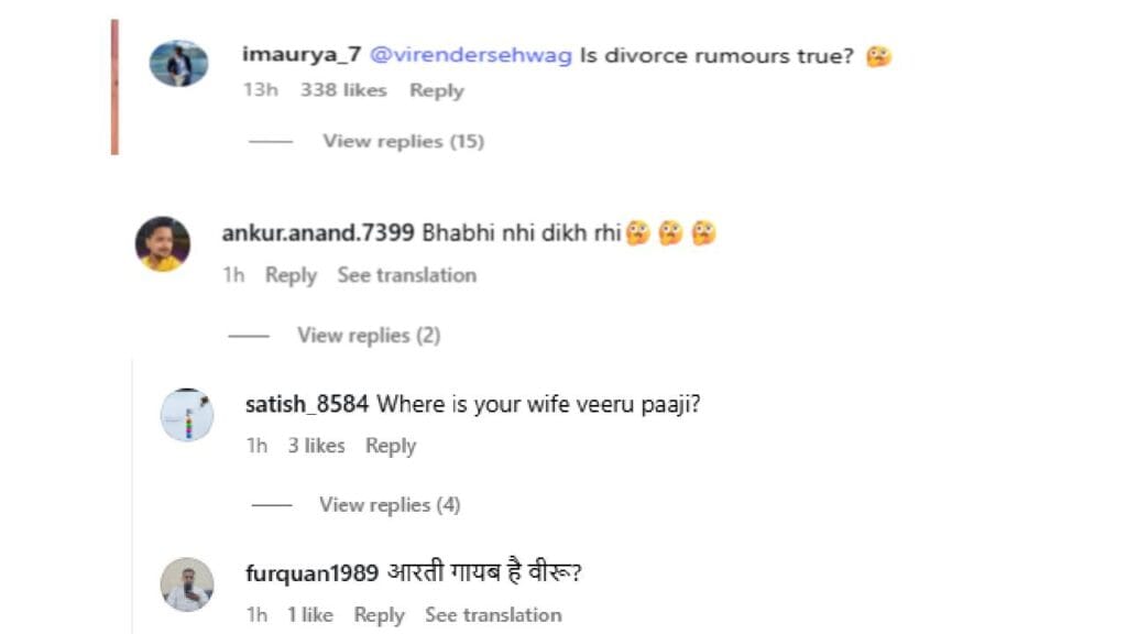 या फोटोवर लाखो लाईक्स आणि हजारो कमेंट्स आल्या. पण काही लोकांनी सेहवागला थेट सवाल विचारले. तुमची पत्नी कुठे आहे ? असं एका यूजरने विचारलं तर अनेकांनी त्याला थेट घटस्फोटाबद्दलच विचारलं. घटस्फोट झाला का ? असा सवालही लोकांनी उपस्थित केला. एवढंच नव्हे तर एकाने लिहीलं – पत्नीशिवाय दिवाळी सण कसा वाटेल ? मुलांची आई सोबत दिसली असती तर चांगलं वाटलं असतं अशी कमेंट आणखी एकाने केली.