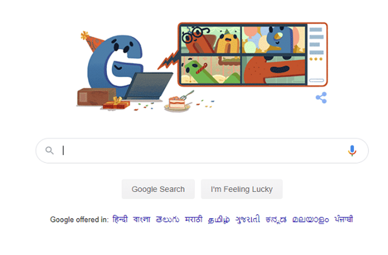आज गुगलचा 22 व्या जन्मदिनानिमित्त एक खास डुडल आहे आणि यामध्ये G अक्षर एका बर्थडेच्या टोपीसारखे तयार केले आहे. तसेच ते अॅनिमेटड आहे. हा G एका लॅपटॉपमध्ये पाहत आहे आणि त्याच्या आजूबाजूला सर्व गिफ्ट बॉक्स, एक केक आहे. तर बाकीचे चार अक्षरं एका विंडोमध्ये दाखवले आहेत.