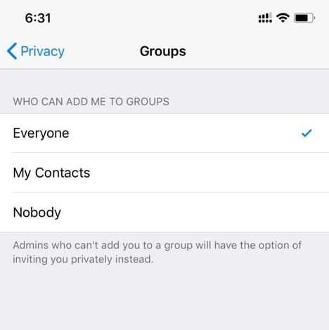 ग्रुप प्रायव्हसी सेटिंगमध्ये तुम्हाला काही पर्याय मिळतील. यामध्ये Everyone, My Contacts आणि Nobody हे पर्याय देण्यात आले आहेत. तुम्ही Nobody हा पर्याय निवडल्यास तुम्हाला कुणीही परवानगीशिवाय ग्रुपमध्ये समाविष्ट करु शकणार नाही. कुणी परवानगीशिवाय समाविष्ट करत असेल तर Nobody मुळे तुम्हाला एक विनंती येईल, जी तुम्ही स्वीकारु किंवा नाकारु शकता.