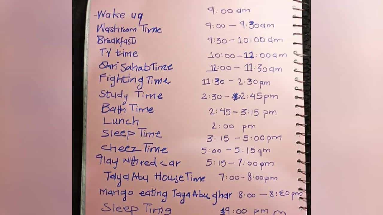 My 6 year old cousin made this timetable…Bas 15 minutes ka study time, zindgi tu Mohid jee ra hai ?? pic.twitter.com/LfyJBXHYPI