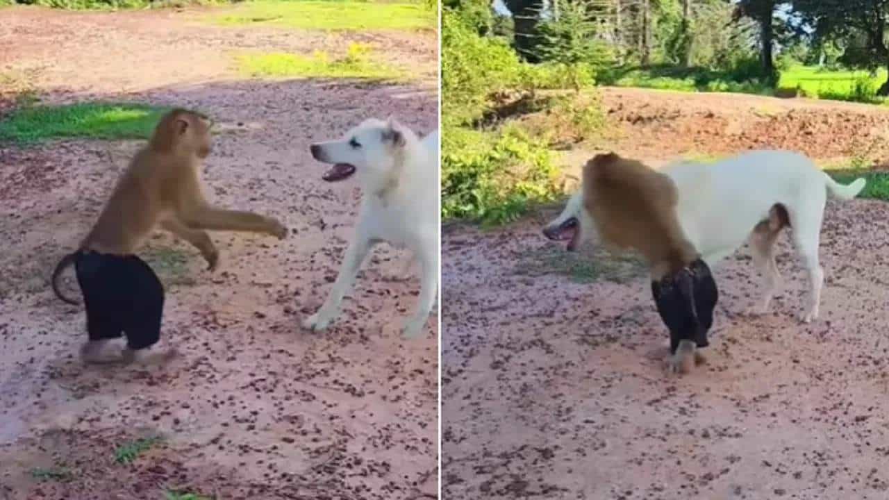 VIDEO | काळी पॅन्ट घातलेल्या माकडाने कुत्र्याला लोळवलं, पाहा व्हायरल व्हिडीओ