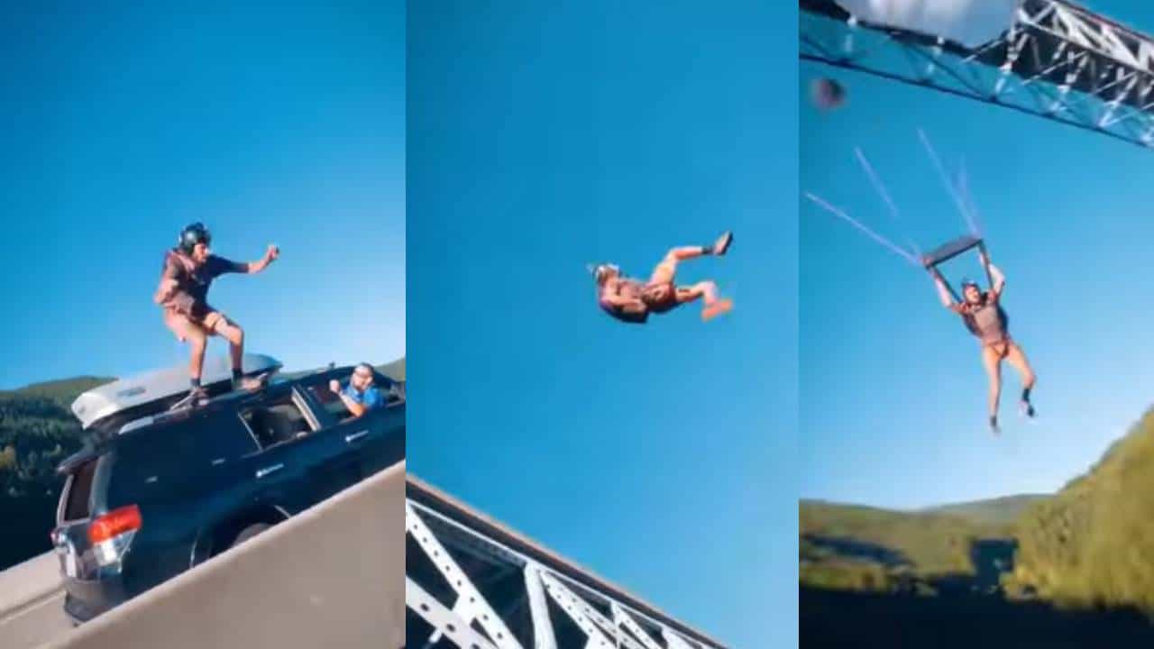 एक व्हीडिओ सध्या सोशल मीडियावर व्हायरल होत आहे. यात एक गाडी रस्त्यावरून जाताना दिसत आहे. त्याच्या टपावर एक माणूस बसलेला दिसत आहे. गाडी एका पुलावरून जाताना दिसते. इतक्यात अनपेक्षित काही घडतं. टपावर बसलेला हा माणूस अचानकपणे चालत्या गाडीवरून बिंधास्तपणे उडी मारतो. खाली खोल दरी दिसतेय.उडी मारल्यावर त्याचं पॅराशूट ओपन होतं. आणि तो हवेत तरंगायला लागतो. त्याचा हा व्हीडिओ सध्या सोशल मीडियावर व्हायरल होत आहे.