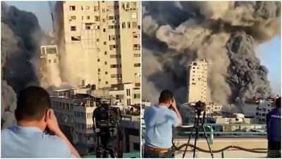 हा व्हिडिओ मागील वर्षाचा असावा. गाझा शहराच्या पश्चिमेकडील अल-रिमल भागात 16 मजली अल-शारोक टॉवरवर हवाई हल्ला झाला. सोशल मीडियावरील स्थानिकांनी येऊ घातलेल्या स्ट्राइकचा इशारा देताना सांगितले, की इस्त्रायली सैन्याने इमारत नष्ट होण्याच्या किमान एक तास आधी छप्पर फाडणारा बॉम्ब टाकला होता. गाझामधील इमारत, ज्यामध्ये स्थानिक आणि परदेशी मीडिया आउटलेट तसेच दुकाने आणि अपार्टमेंट होती. याआधी 2014मध्ये इस्रायलने गाझावर केलेल्या हल्ल्यादरम्यान क्षेपणास्त्र हल्ल्याचाही फटका बसला होता. दरम्यान, या हल्ल्यानंतर काळ्या धुराचे लोट निघत असल्याचे दिसत आहे.