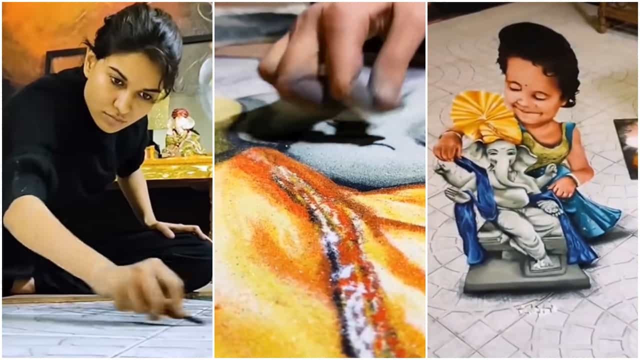 व्हिडिओमध्ये पाहू शकता, की एक महिला कलाकार आधी जमिनीवर पेन्सिलने कच्चा आराखडा तयार करते. जी रांगोळी साकारायची आहे, ते चित्र जमिनीवर काढते. मग विविध रंगांच्या रांगोळीने कलाकृती साकारायला लागते. ही रांगोळी एक चिमुकली आणि तिच्या हातामध्ये गणपती बाप्पाची मूर्ती अशास्वरुपाची असते. विशेष म्हणजे ही साधी रांगोळी नसून थ्रीडी स्वरुपातील रांगोळी आहे.