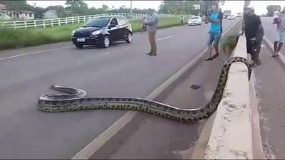 मुंबई : सोशल मीडियावर रोजच अनेक व्हिडीओ व्हायरल होतात यातील काही व्हिडीओ हे अतिशय मजेदार असतात. तर काही व्हिडीओंना पाहून आपल्याला हसू फुटते. सध्या चर्चेत आलेला व्हिडीओ एका महाकाय अजगराचा आहे. हा अजगर पाहून अनेकांनी आश्चर्य व्यक्त केले आहे. अजगराच्या धाडसाला तसेच त्याच्या महाकाय शरीराला पाहून नेटकरी थक्क झाले आहेत. हा व्हिडीओ सध्या सोशल मीडियावर व्हायरल होत आहे. (anaconda crossing road in brazil video went viral on social media)
