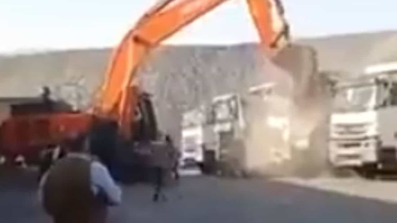 (angry man crushing trucks by jcb video went viral on social media)