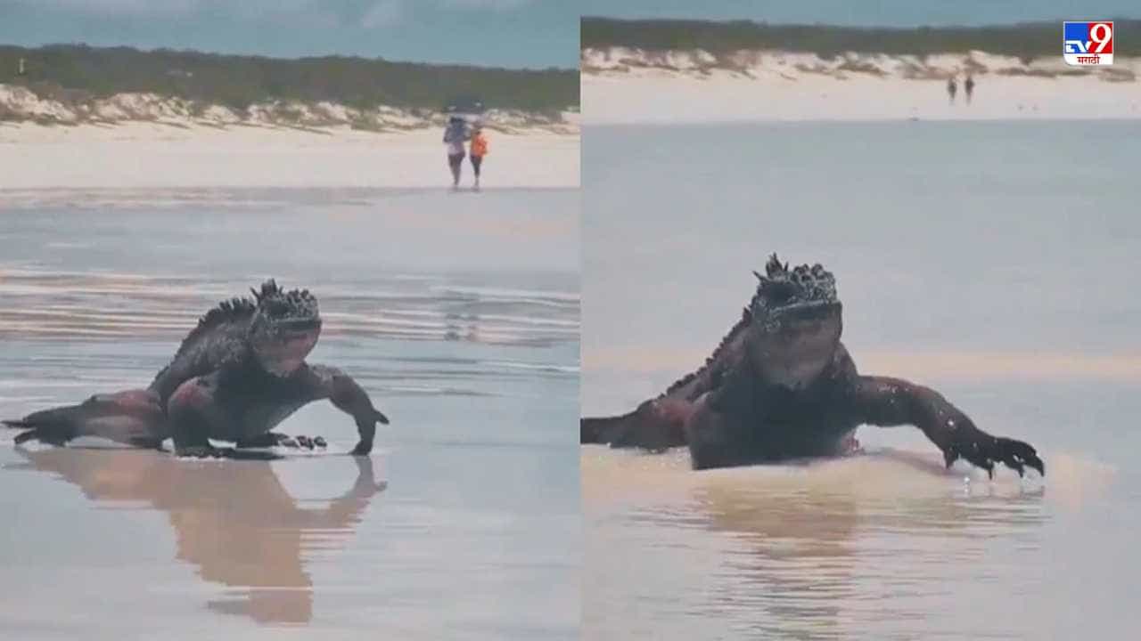 सोशल मीडियावर वेगाने व्हायरल होत असलेला हा व्हिडिओ समुद्रकिनाऱ्याचा आहे. व्हिडिओ क्लिपमध्ये तुम्ही पाहू शकता की, एक महाकाय सरड्यासारखा प्राणी समुद्रकिनारी फिरताना दिसत आहे. हा प्राणी इतका भयंकर दिसतोय की त्याला पाहून कोणाच्याही हृदयाचे ठोके वाढतात. व्हिडिओमध्ये काही लोक बीचवर फिरतानाही दिसत आहेत. पण त्यांना बघून जणू काही त्यांची नजर या प्राण्यावर पडलीच नाही. (Animal Viral video mysterious animal seen on the beach netizens says its a mini godzila but its a marine laguna lizard from galapagos islands)