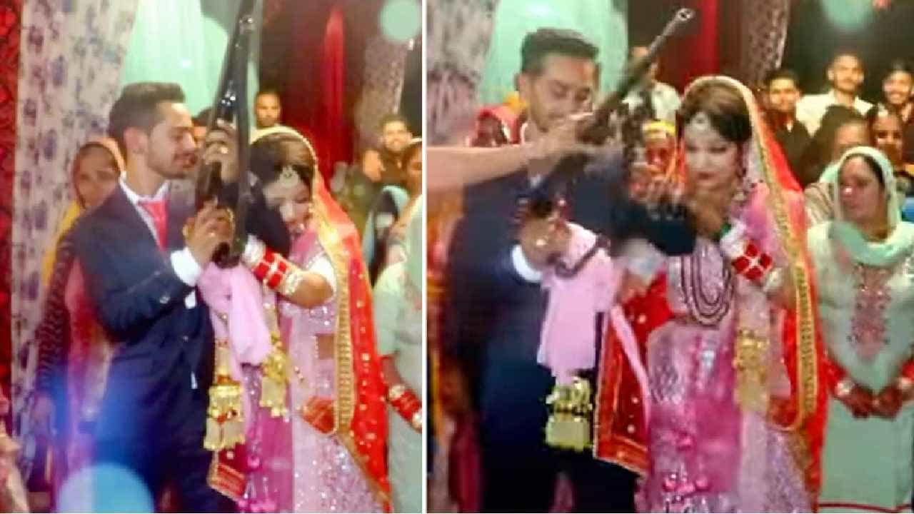 व्हायरल झालेल्या व्हिडीओमध्ये, वधू आणि वर आणि वऱ्हाडी मंडळी दिसत आहेत. तेवढ्यात कुणीतरी वराच्या हातात बंदूक आणून देतो, वर ती बंदू वधूच्या हातात देतो