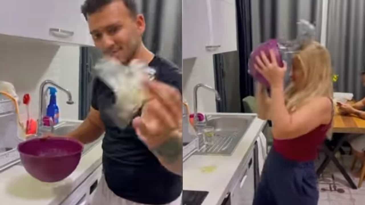 त्याचवेळी त्याची मैत्रीण त्याठिकाणी आल्याचे व्हीडिओत दिसत आहे. या मुलीने ओट्यावरील वाडगा उचलण्याचा प्रयत्न केला. मात्र, वाडगा बाजूने चिकटल्यामुळे वाडगा सहजपणे उचलला जात नाही. त्यामुळे वैतागून मुलीने वाडगा पूर्ण जोर लावून उचलला. मात्र, त्यामुळे वाडग्यातील सर्व पाणी मुलीच्या अंगावर सांडते. हे पाहून मुलगा जोरजोरात हसताना दिसत आहे. या प्रकारामुळे मुलगी काहीशी चिडते आणि मुलाच्याही अंगावर पाणी ओतते.