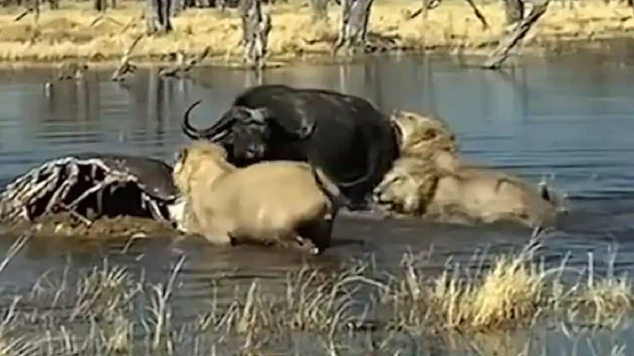 व्हिडीओमध्ये तीन सिंह एका गव्याला पाण्यात फसवतात. त्याचवेळी आपला जीव वाचवण्यासाठी गवा कासावीस होतो. तीन सिंह एकाचवेळी गव्यावरती हल्ला करतात. परंतु गव्याचा अधिक ताकद असल्याचं लक्षात आल्यानंतर त्यापैकी दोन सिंह माघार घेतात. त्याचबरोबर गवा सुद्धा त्यांच्यावर हल्ला करतो. एक सिंह गव्यावरती मागच्या बाजूने हल्ला करतो. त्याचवेळी काहीवेळ विश्रांती घेतल्यानंतर गवा त्या सिंहाला एका हिसड्यात फेकून देतो. ज्यावेळी सिंहाला जोराचा हिसडा दिला, त्यावेळी तो हवेत उडाला. त्यानंतर त्याचा पाय गवाच्या शिंगात अडकला आहे. त्यावेळी सिंह आपला जीव वाचवण्यासाठी पुन्हा गव्याशी भिडतो. काहीवेळाने सिंह तिथून पळ काढतो.