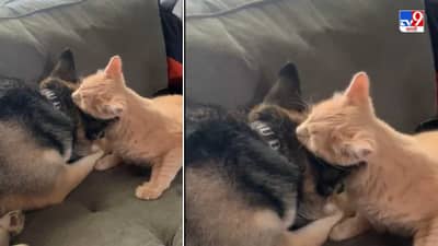 कुत्रा मांजराचे अनेक मजेदार व्हिडिओ सोशल मीडियावर व्हायरल होत असतात. यापैकी काहींमध्ये दोघांमध्ये भांडणं होताना दिसतात. , तर काही एवढे मजेशीर असतात की, तुम्ही पोट धरुन हसता. सध्या कुत्रा आणि मांजरीचा असाच एक व्हिडिओ सोशल मीडियावर व्हायरल होत आहे, ज्यामध्ये जर्मन शेफर्ड जातीचा कुत्रा सोफ्यावर आनंदाने झोपलेला दिसत आहे. या दरम्यान मांजर अशी काही कृती करते, की आपल्याला प्राणीप्रेम काय असतं हे कळतं. ( Cat Cute Video Goes Viral animal video when see licks sleeping dog will make you laugh cat dog viral video funny video)