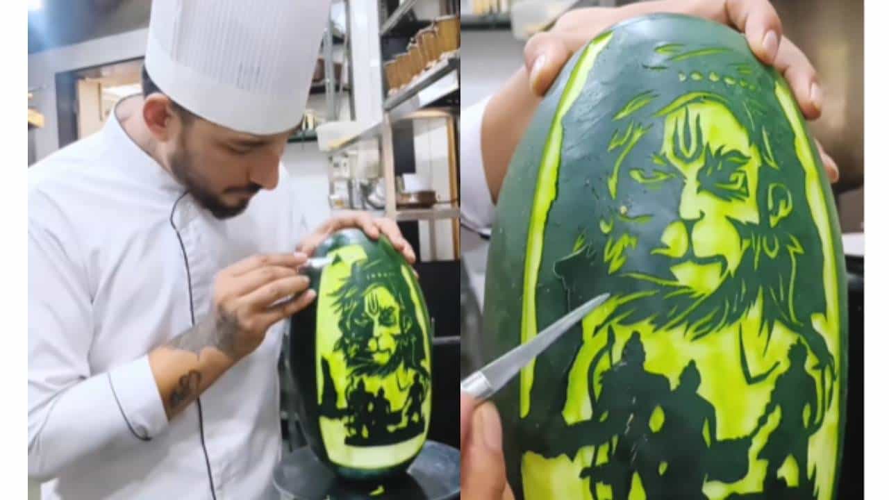केवळ धारदार चाकूचा वापर करून कलिंगडावर कोणाचेही चित्र रेखाटण्याची प्रतिभा शेफ अंकित बागियाल यांच्याकडे आहे. शेफची ही अद्भुत कला इन्स्टाग्राम वापरकर्त्यांमध्ये प्रसिद्ध आहे. त्यांचे फॅन्स त्यांची कलाकृती दर्शविणारा कोणताही व्हिडिओ चुकवत नाहीत. अंकित नेहमीच एखादा प्रसंग किंवा मुद्दा निवडतो आणि त्याविषयी कलाकृती तयार करतो. उदाहरणार्थ, त्यांनी पंजाबी गायक सिद्धू मूसेवाला यांना सुद्धा अशाच पद्धतीने आदरांजली वाहिली होती. अलीकडेच बहुप्रतीक्षित आदिपुरुष हा चित्रपट प्रचंड चर्चेत आहे. त्या विषयाला घेऊनच अंकितने कलिंगडावर हनुमानाची मनमोहक प्रतिमा कोरलीये.