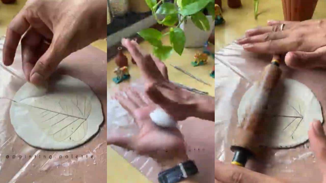 ही व्यक्ती मातीचा गणपती बनवतोय. प्रथम, हा तो चिकणमातीला एका मोठ्या गोलामध्ये आकार देतो. यानंतर वेगवेगळ्या आकाराची पिंपळाची पान ठेवतो. यानंतर त्या पानांवर रंग भरला जातो.