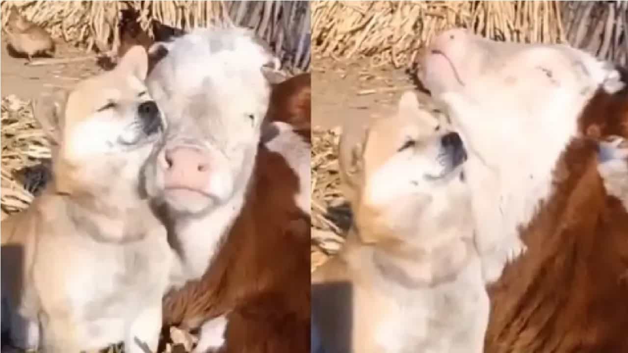 कुत्रा आणि गाय एकमेकांच्या मिठीत
