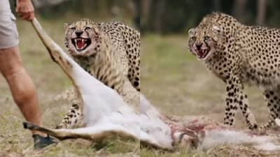 मुंबई : सध्या सोशल मीडियावर एक थरारक व्हिडिओ (Video) खूप व्हायरल होत आहे. या व्हिडीओमध्ये एक माणूस चित्त्याच्या समोरून त्याने केलेली शिकार घेऊन जात आहे. व्हिडिओमध्ये चित्त्याच्या (Cheetah) चेहऱ्यावरील हावभाव पाहण्यासारखे आहेत. हा व्हिडीओ बघितल्यानंतर यूजर्स आश्चर्यचकित आहेत की, त्या व्यक्तीमध्ये एवढी हिंमत कुठून आली, ज्याने चित्याच्या समोरून त्याचे अन्न हिसकावून घेण्याचे धाडस केले.