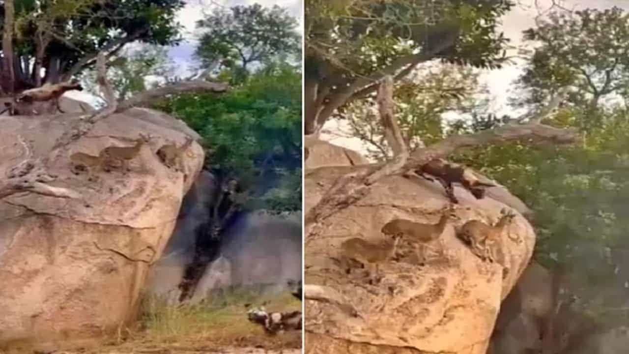 व्हिडिओमध्ये तुम्ही पाहू शकता, की एका उंच दगडाच्या अगदी काठावर तीन हरणे लपून बसली आहेत, तर खालपासून वरपर्यंत जंगली कुत्र्यांचा कळप जेव्हा त्यांची शिकार करण्यासाठी खाली येतो तेव्हा ते हरीण जागेवरून हलत नाही. शेवटी, प्रत्येकाला आपला जीव प्रिय असतो. एक-दोन जंगली कुत्रे किनाऱ्यावर जाऊन हरणांपर्यंत पोहोचण्याचा प्रयत्न करतात, पण ते अयशस्वी राहतात. जंगली कुत्रे बराच वेळ तिथे डोळे लावून बसतात, पण त्यांची शिकार दगडावरून खाली उतरण्याचे नाव घेत नाही.