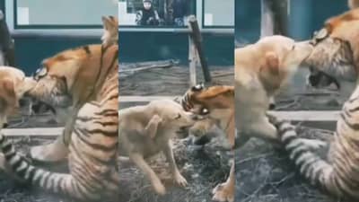 या व्हायरल व्हिडीओमध्ये कुत्र्याने वाघाचा कान पकडला, कुत्रा काय वाघाचा कानच सोडेना. तो वाघाचे कान खूप वेळ चावत राहिला.