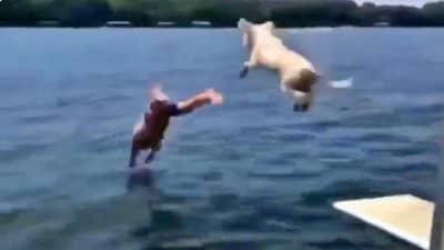 व्हायरल होत असलेल्या व्हिडिओमध्ये तुम्ही बघू शकता, की एक व्यक्ती पोहण्यासाठी दुरून धावत येत आहे आणि पाण्यात उडी मारते आहे. यादरम्यान त्याच्या मागे एक कुत्राही असतो, जो त्याच्यासोबत पाण्यात उडी मारतो. ती व्यक्ती कुठे उडी मारत आहे, त्याचे काय नुकसान होऊ शकते याचा विचारही तो करत नाही. तो नुसता मागे-पुढे चालतो आणि जातो आणि उडी मारतो.