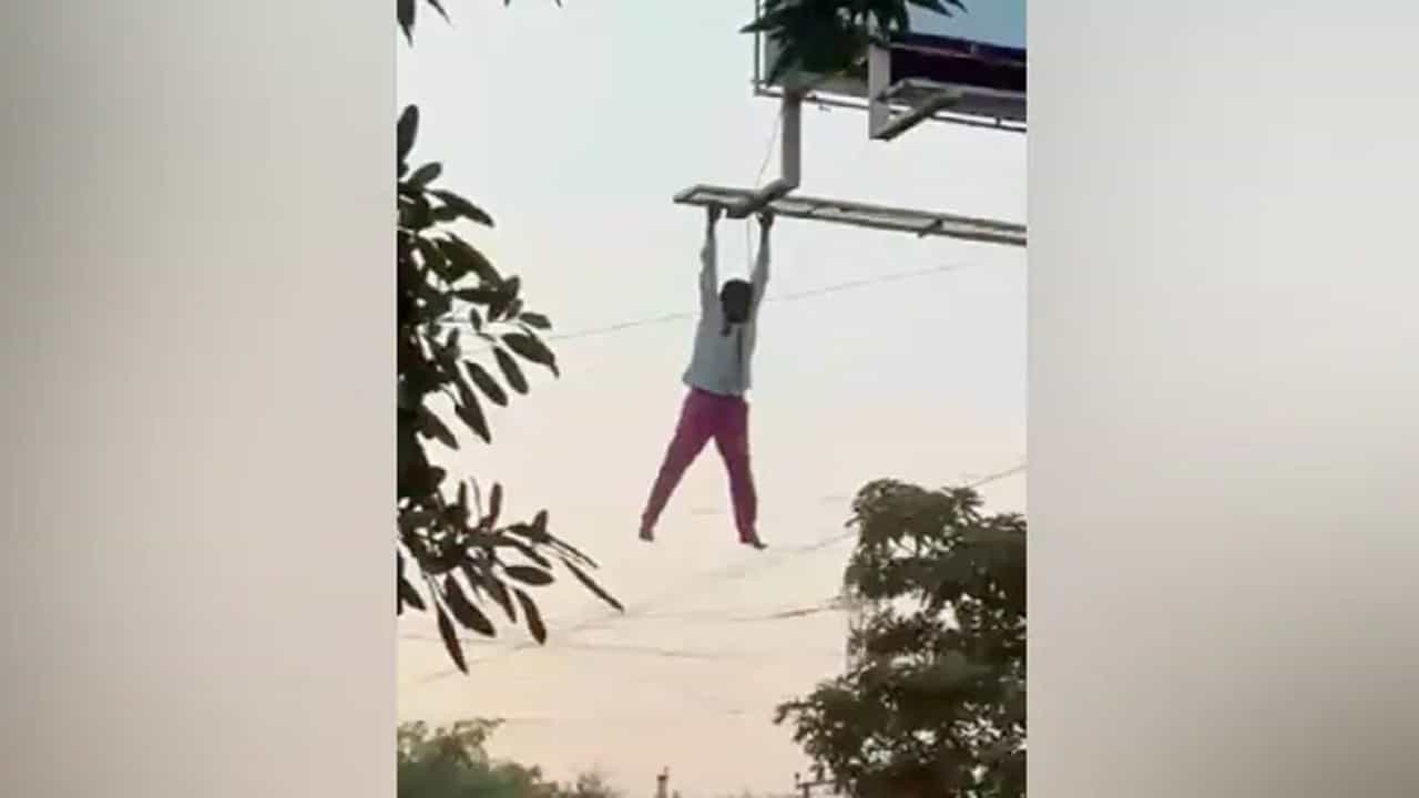 रस्त्यात एक होर्डींग आहे, त्याला दारु पिलेला एकजण लटकलेला दिसतोय. तो जोरात ओरडत आहे. त्यामुळे तिथली लोकं एका जागी जमली आहेत. काही मिनिटं तो तसाचं लटकलेला आहे. त्यानंतर तिथं एक पिवळ्या रंगाची बस लावली जाते. एका बाजूने दोर टाकून लोकं आणि पोलिस त्याला खाली उतरवतात. त्यानंतर पोलिसांनी गुन्हा दाखल केला आहे.